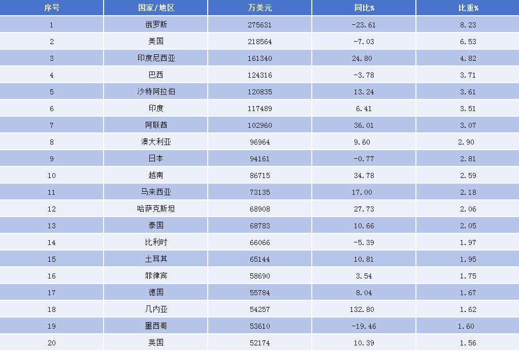 主要市场中,对俄罗斯和美国出口明显下降,占比分别降至8.23%和6.53%;而对印尼、沙特、印度、阿联酋、澳大利亚、越南、马来西亚、哈萨克斯坦、泰国、土耳其、几内亚等国的出口保持良好增长态势。