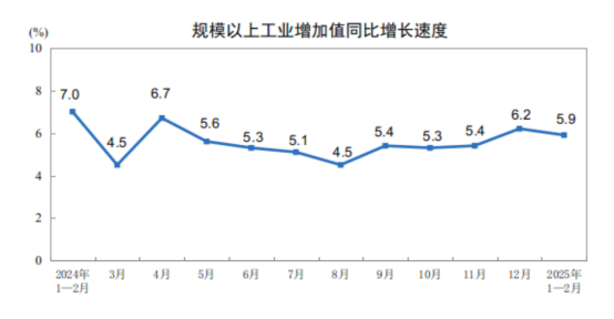 1-2月份,规模以上工业增加值同比实际增长5.9%(增加值增速均为扣除价格因素的实际增长率)。从环比看,2月份,规模以上工业增加值比上月增长0.51%。