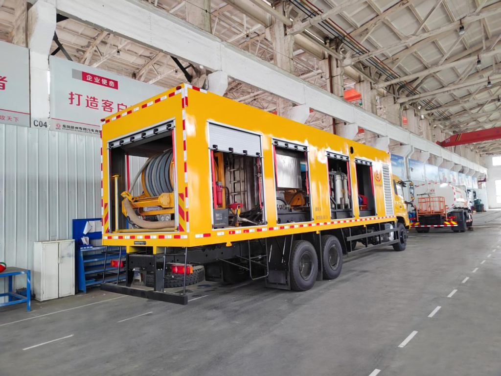 高压力、大流量:机组自主研发设计,高压泵引进美国进口技术,整机采用柴油发动机驱动450T型高速大流量泵,流量可达900L/min,压力可达250bar的环保低音高效疏通装备。