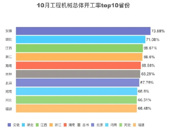 其中,安徽的挖掘设备为繁忙,开工率为81.94%,位居全国同类设备开工率;江西挖掘设备开工率80.60%,位居第二;湖北79.41%,位列第三。