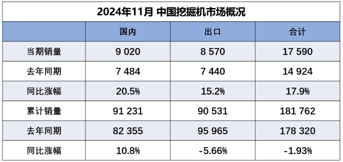 据中国工程机械工业协会对挖掘机主要制造企业统计,2024年11月销售各类挖掘机17590台,同比增长17.9%。其中国内销量9020台,同比增长20.5%;出口量8570台,同比增长15.2%。