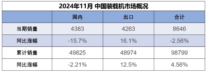 据中国工程机械工业协会对装载机主要制造企业统计,2024年11月销售各类装载机8646台,同比下降2.56%。其中国内销量4383台,同比下降15.7%;出口量4263台,同比增长16.1%。