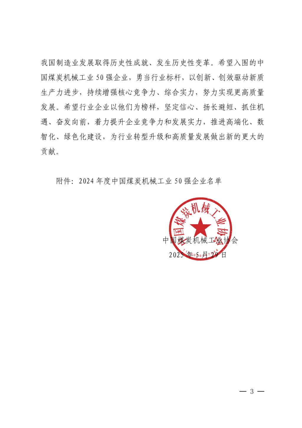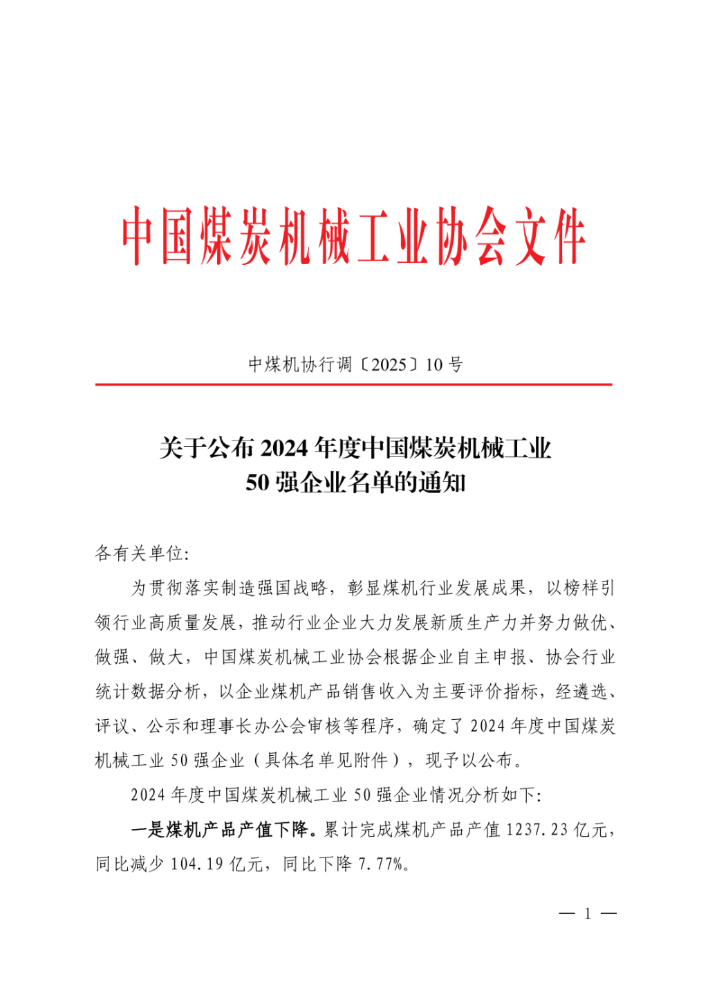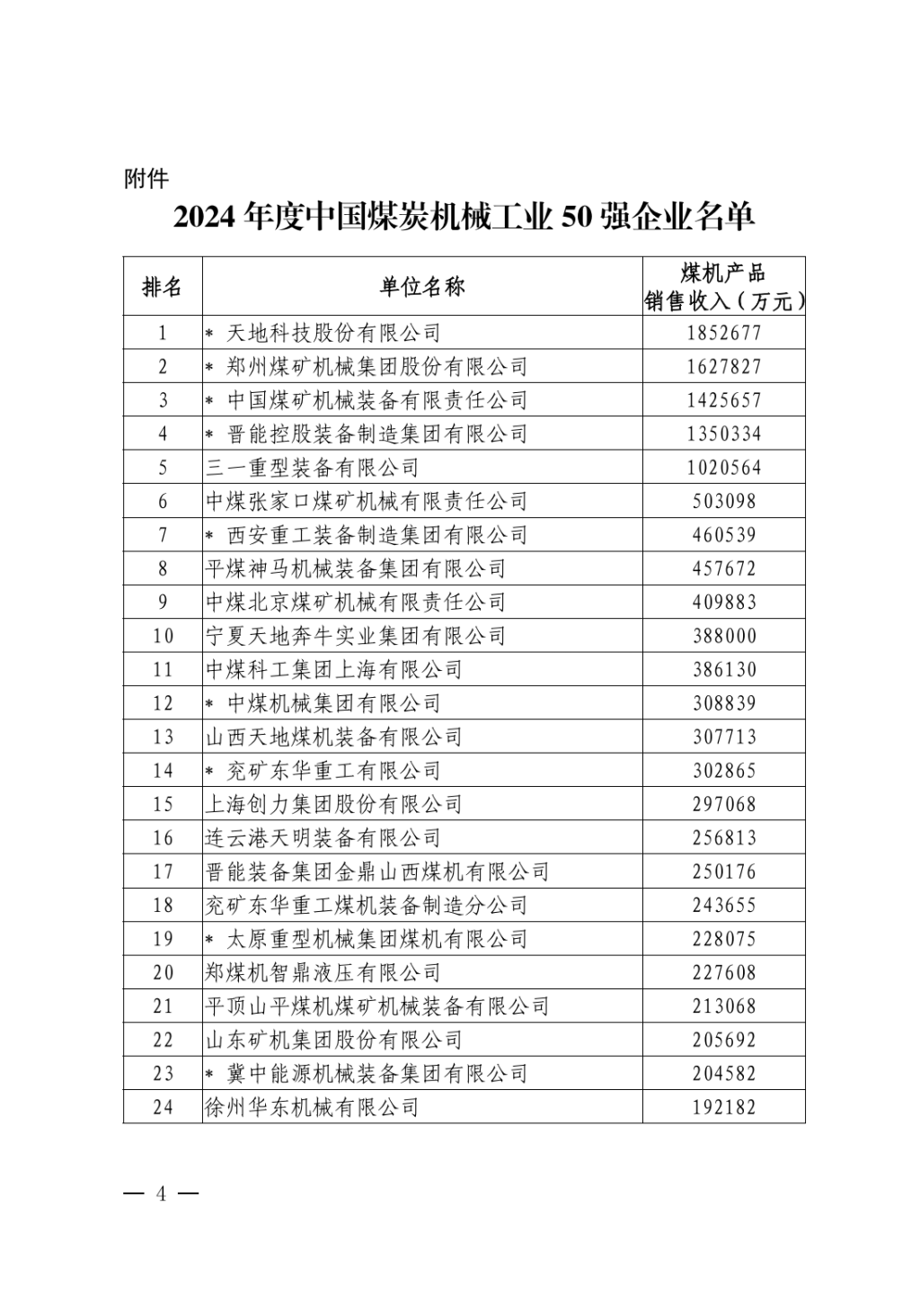 为贯彻落实制造强国战略,彰显煤机行业发展成果,以榜样引领行业高质量发展,推动行业企业大力发展新质生产力并努力做优、做强、做大,中国煤炭机械工业协会根据企业自主申报、协会行业统计数据分析,以企业煤机产品销售收入为主要评价指标,经遴选、评议、公示和理事长办公会审核等程序,确定了2024年度中国煤炭机械工业50强企业,现予以公布。