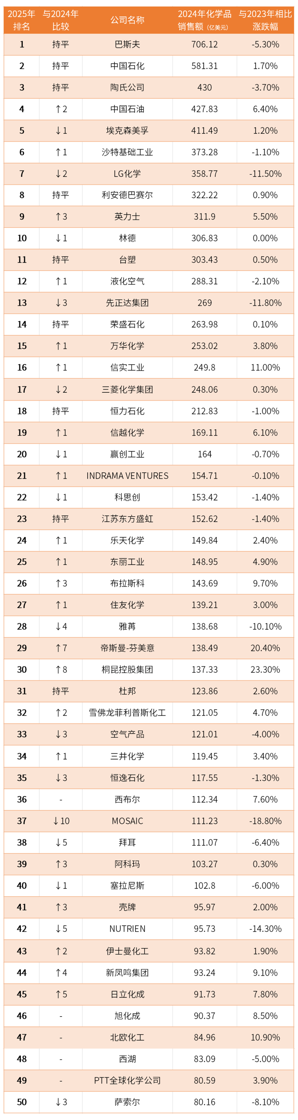 近日美国《化学与工程新闻》(C&EN)公布“2025年全球化工企业50强”。