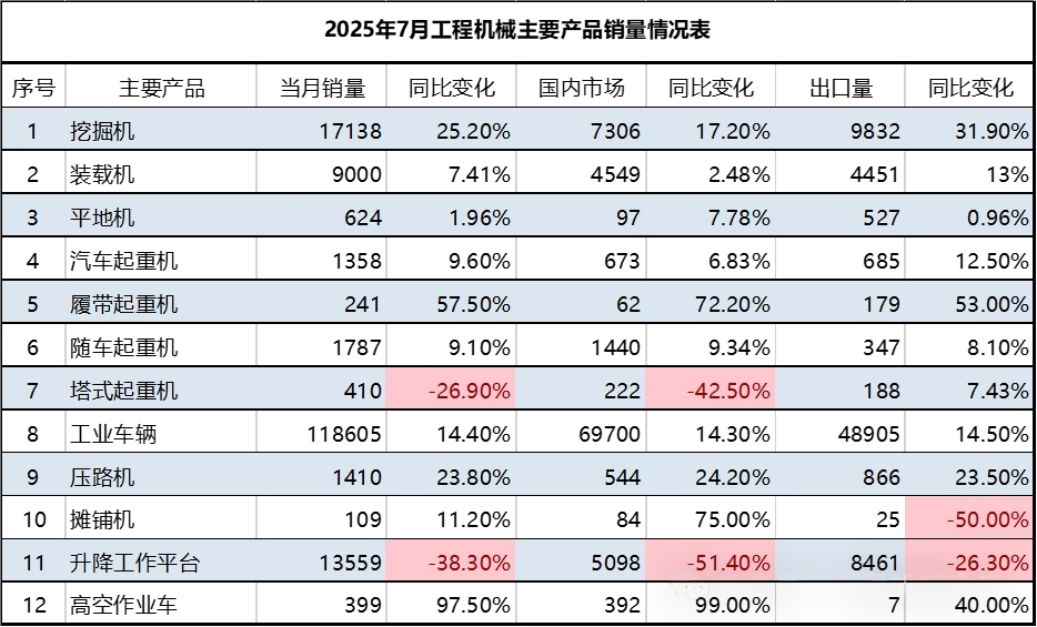据中国工程机械工业协会对挖掘机主要制造企业统计,2025年7月销售各类挖掘机17138台,同比增长25.2%。其中国内销量7306台,同比增长17.2%;出口量9832台,同比增长31.9%。
