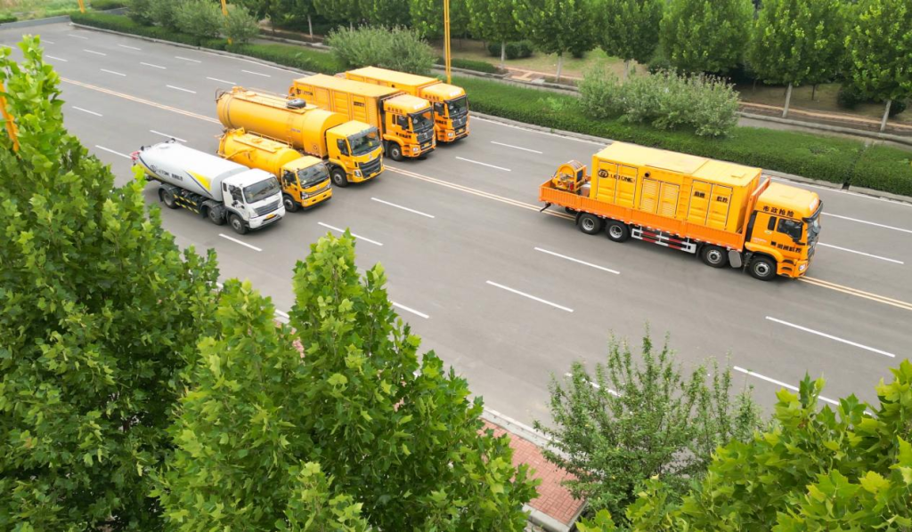 高压力、大流量:机组自主研发设计,高压泵引进美国进口技术,整机采用柴油发动机驱动450T型高速大流量泵,流量可达900L/min,压力可达250bar的环保低音高效疏通装备。